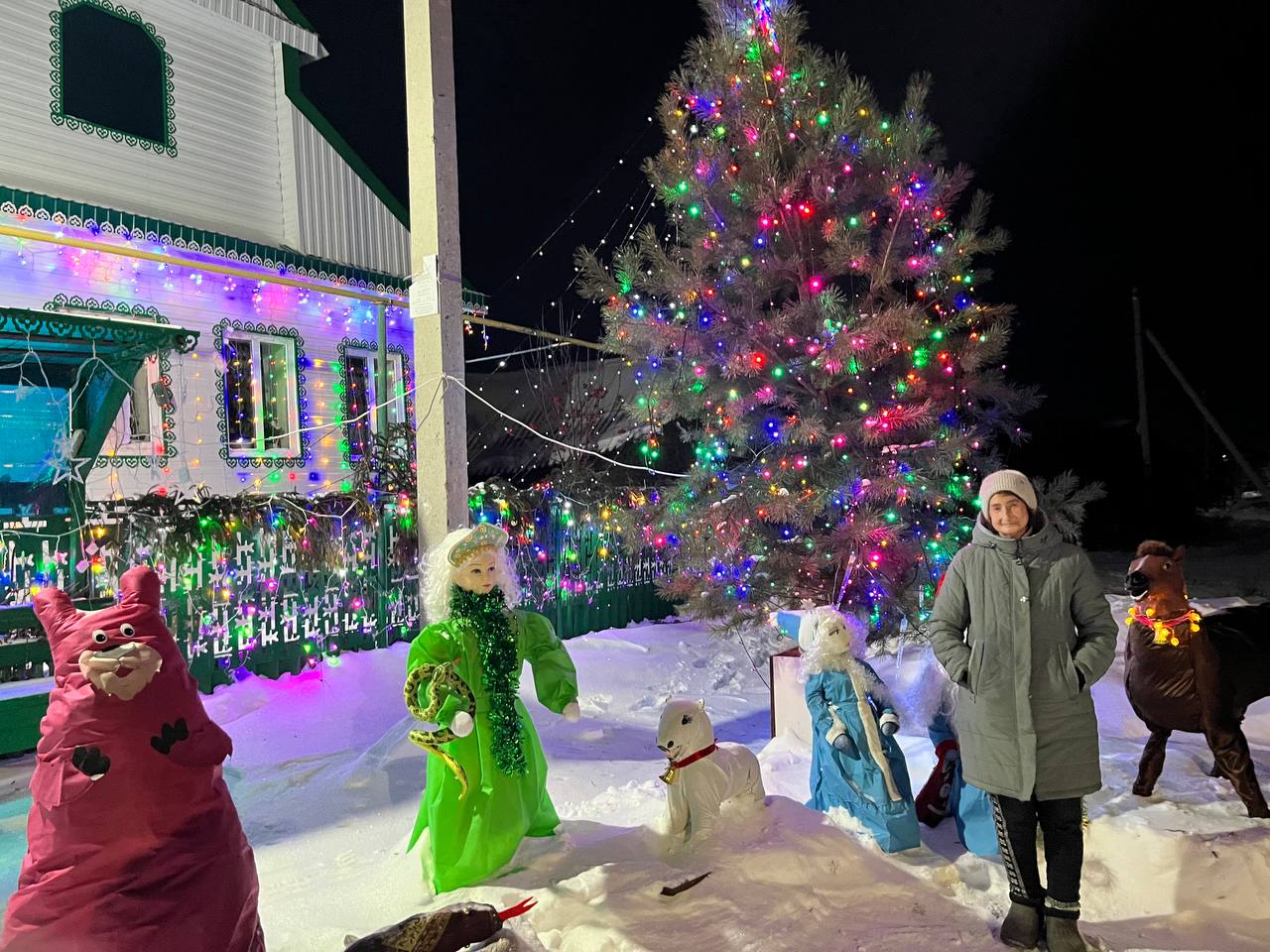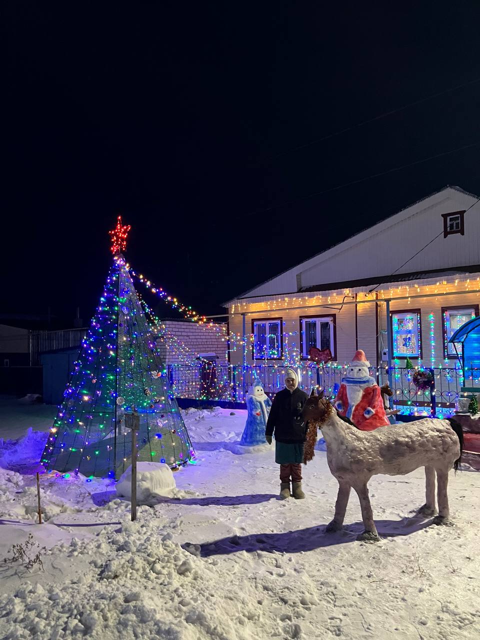 Экран эшләп тора, төсле утлар биеше – искитмәле. Уң як күршеләре исә төп конкурент! Марат әфәнде Раимов йорт янын гына бизәп калмыйча, хәтта сараендагы ике понига кадәр урамга чыгарган. Көн саен балалар урамнан үтә, туктап, сокланып карап торалар ди ул. Яңа ел төнендә күршеләрнең икесе дә капка төбендә өстәл көйләгән, үткән-сүткәннәр чәйләгәннәр. Хәттә дискәтүк ясап, биегәннәр.