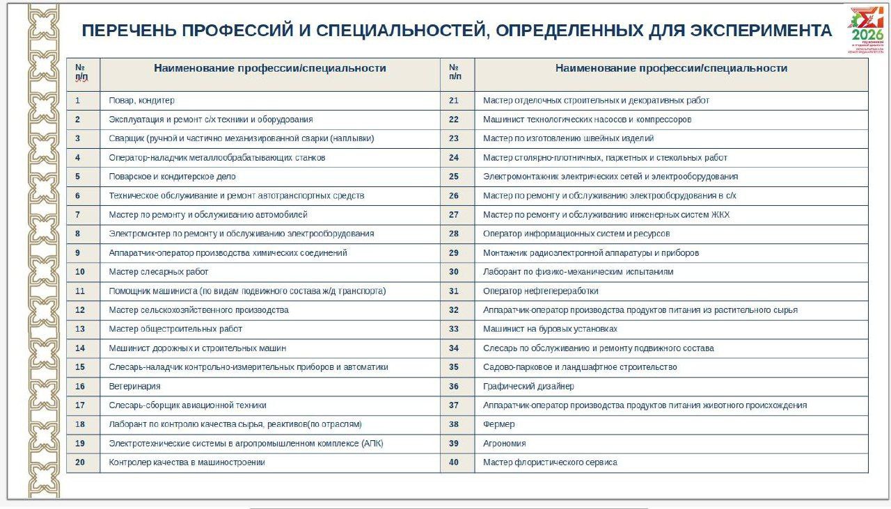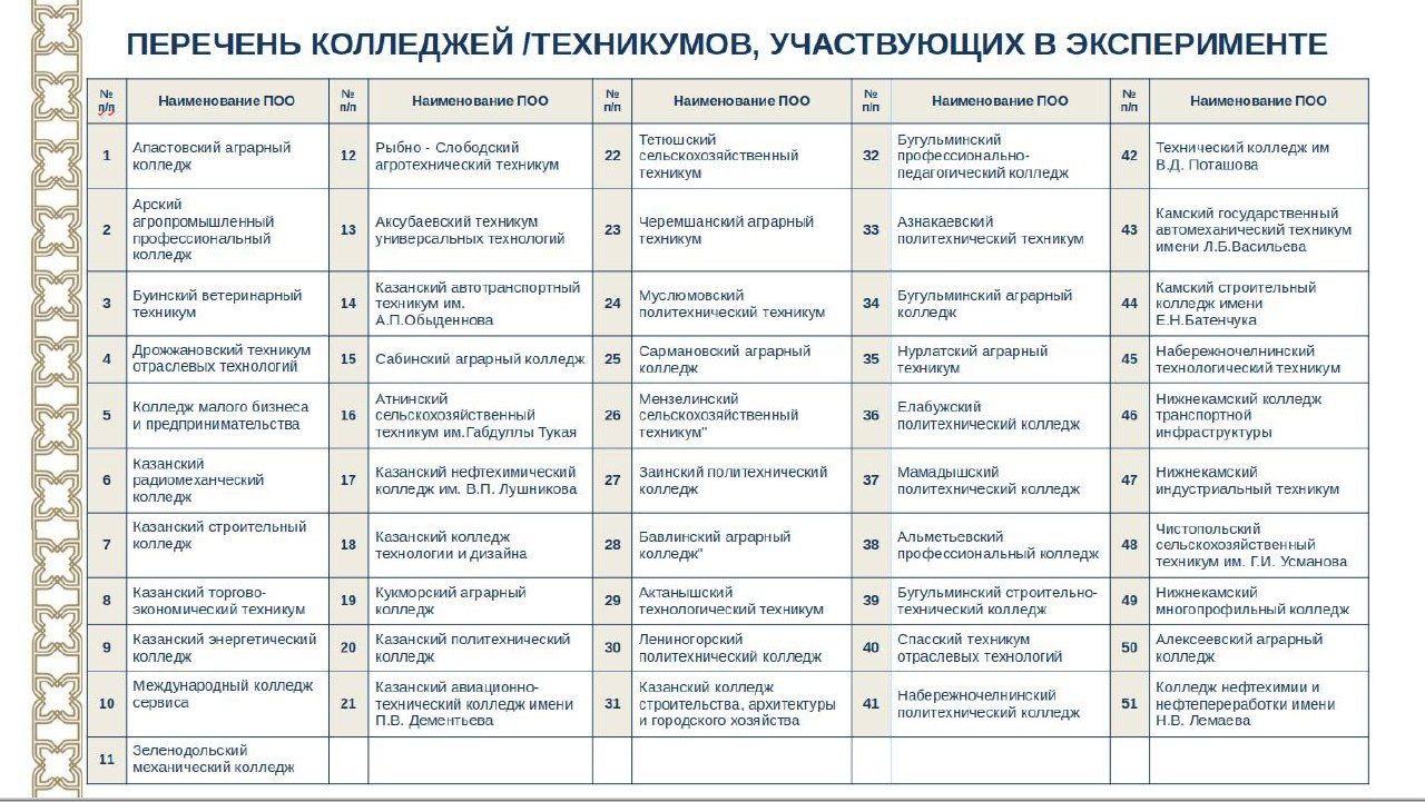 Татарстанда эксперимент кысаларында 40 һөнәр билгеләнде. Алар 51 көллият һәм техникумда гамәлгә ашырылачак. Һөнәрләр исемлеге төбәк икътисады ихтыяҗларын, хезмәт базарында дефицитлы белгечлекләрне, «Россиядә эш» порталы мәгълүматларын һәм эш бирүчеләр фикерен исәпкә алып төзелгән. Әлеге белгечлекләр буенча уку бюджет хисабына, бушлай оештырылачак.