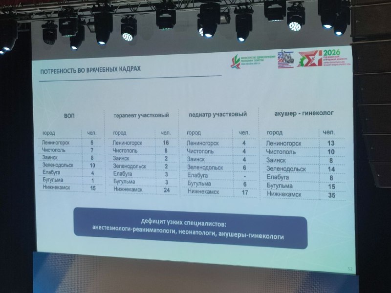 Татарстанда табиблар белән тәэмин ителеш Россия буенча уртача күрсәткечтән 8 процентка түбән. Бүген һәр 10 мең кешегә 35 табиб туры килә. Аеруча дефицит белгечлекләр - участок терапевтлары һәм педиатрлар, гомуми практика табиблары, акушер-гинекологлар, шулай ук анестезиолог-реаниматологлар, неонатологлар. Кадрлар кытлыгы мәсьәләсе Татарстан Сәламәтлек саклау министрлыгы коллегиясендә үзәккә куелган мәсьәләләрнең берсе булды.