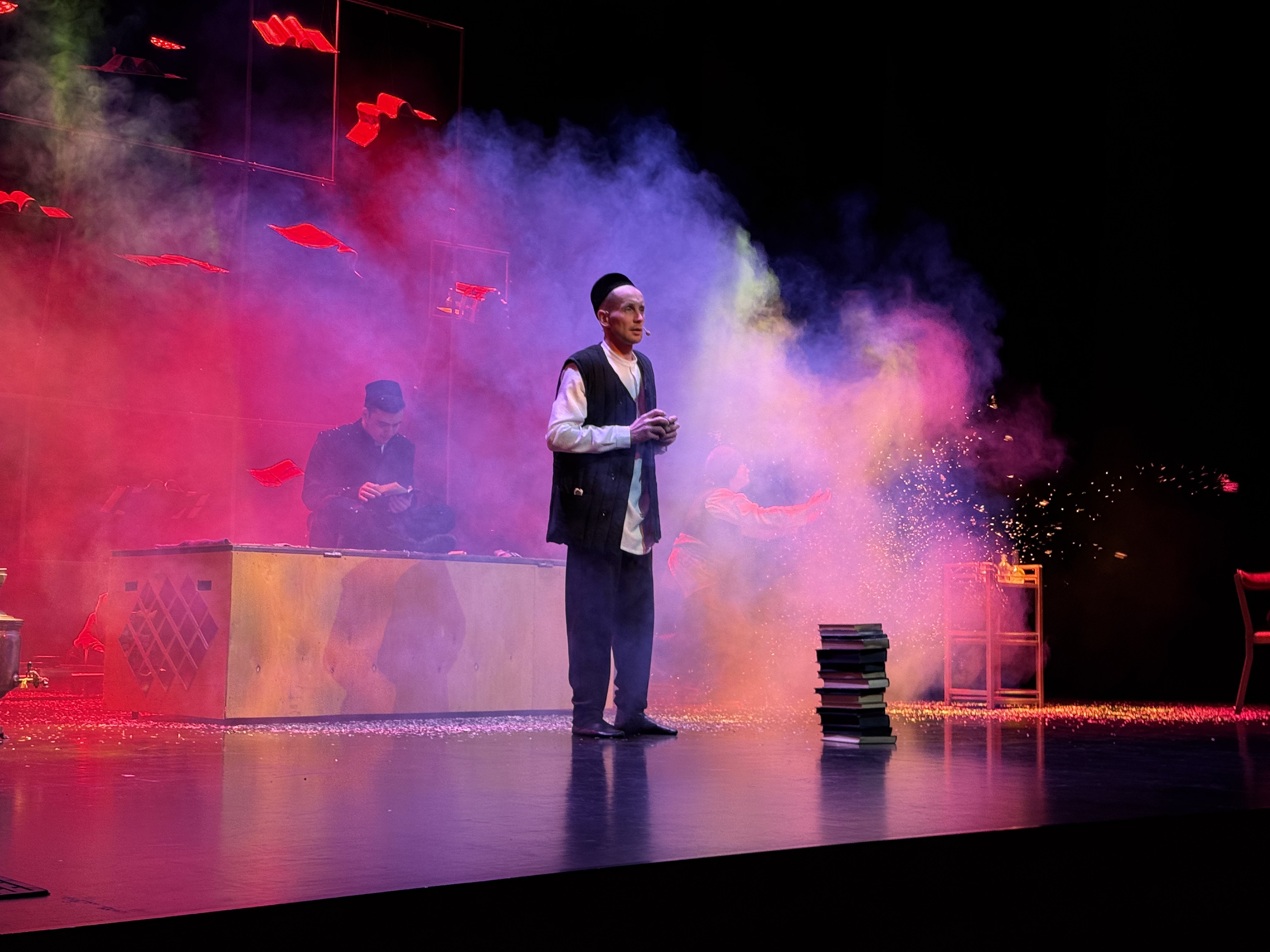 Сорау тудырган мизгелләр дә булды. Мәсәлән, бер мизгелдә яшь Гаяз Исхакый (тарихта Насыйри белән Исхакыйның күрешүе билгеле) Каюм Насыйри янына килеп сүзлек сорый, сүзлек китабы кулына эләккәч, әле бая гына геройлар сәке итеп утырып чәй эчкән сандык өстенә менеп баса. Спектакльдән соң махсус оештырылган түгәрәк өстәл форматындагы уртага салып сөйләшүдә режиссёр Әминә Миндиярова (Мәскәүдә булса да, аны турыдан-туры элемтәгә чыгару җаен табулары өчен театрга өстәмә бер плюс!) моны китапның көчен, бөеклеген күрсәтү дип аңлатты. Ягъни Гаяз китапны тагын да өскә, биеккә күтәрә. Самавырның идәндә торуы да бераз гаҗәп тоелды. Монысы турында хезмәттәшләрем “спектакльдә барысы да диярлек шартлылыкка корылган бит, самавырның идәндә торуын да шул шартлылыкка бәйләргә була.