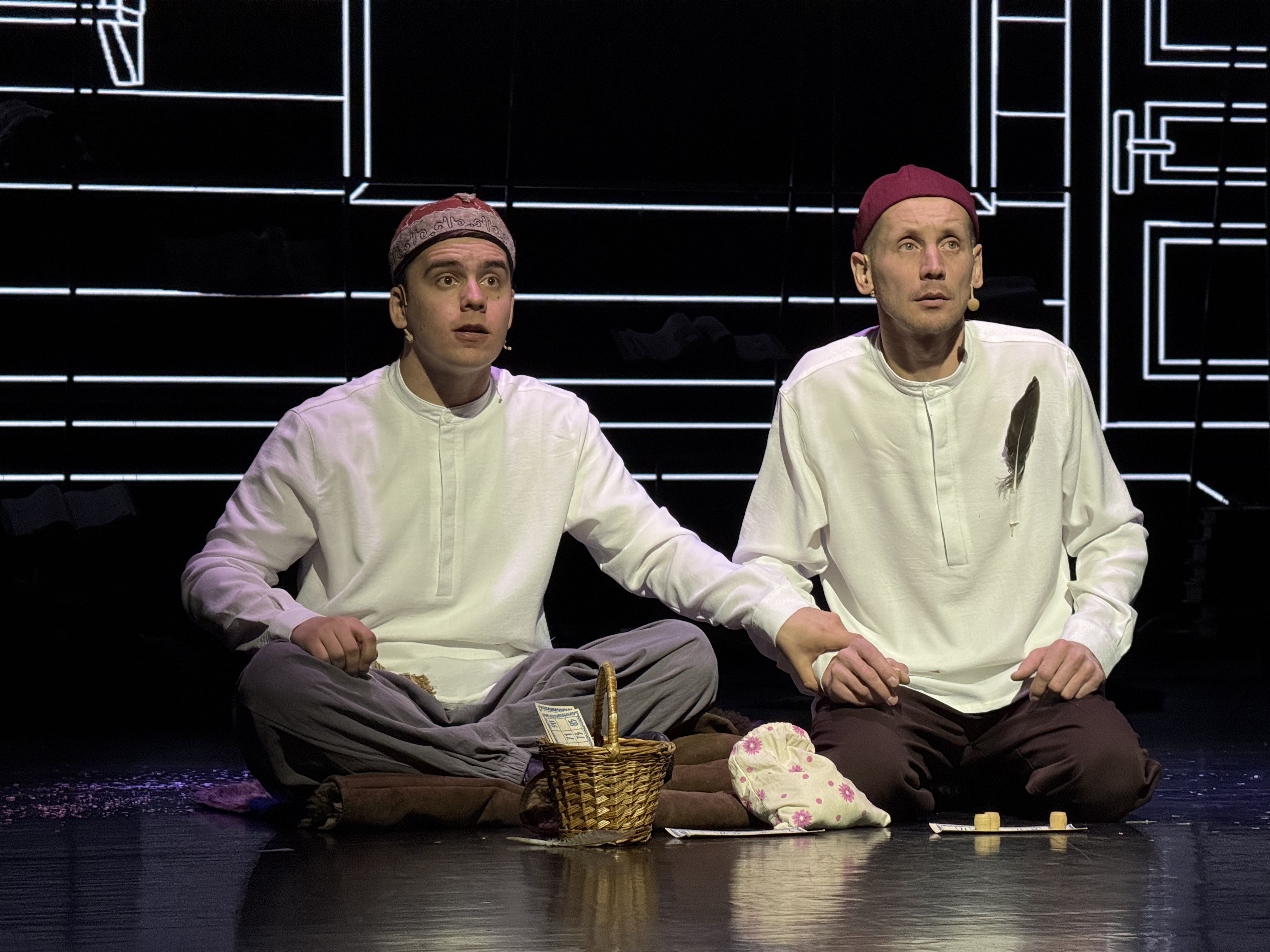 Спектакльдә персонажлар күп түгел. Вакыйгалар алышынганда иңөстенә Казан җөе белән чигелгән читек аскан героиня берничә кат чыга. Монысын да очраклылык итеп кабул итмисең. Режиссёр Казан җөен үзләштереп, үзлегеннән шулай чигә башлаган Насыйрины күрсәтә, галимнең тынгысыз җан булуына ишарәли.