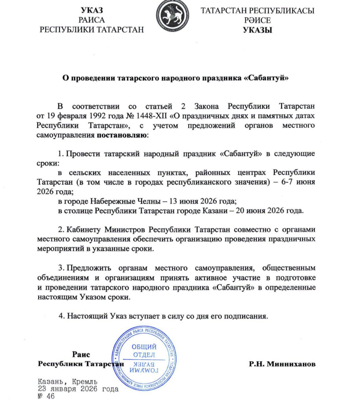 Татарстан Рәисе Рөстәм Миңнеханов шул турыда указга кул куйган.